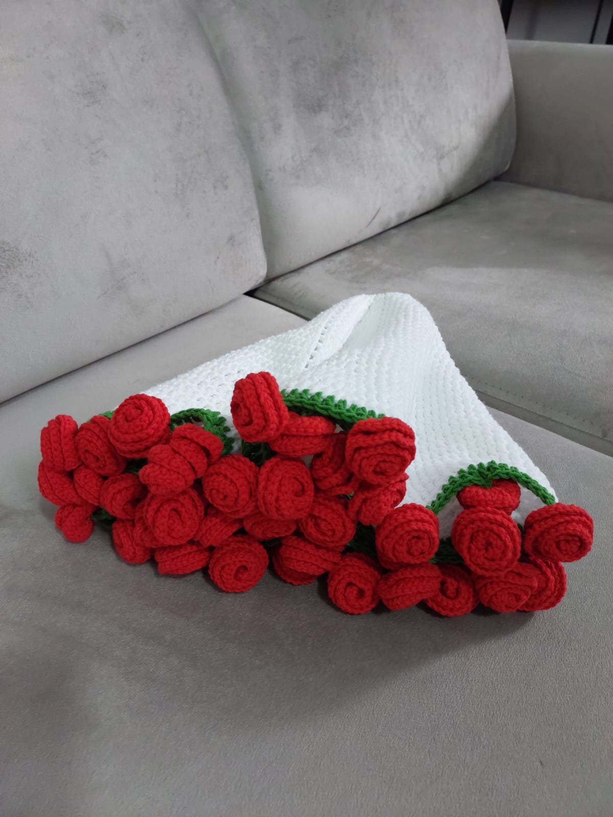 Evinize Zarif Bir Dokunuş: El Yapımı Kırmızı Gül Motifli Buket Battaniye